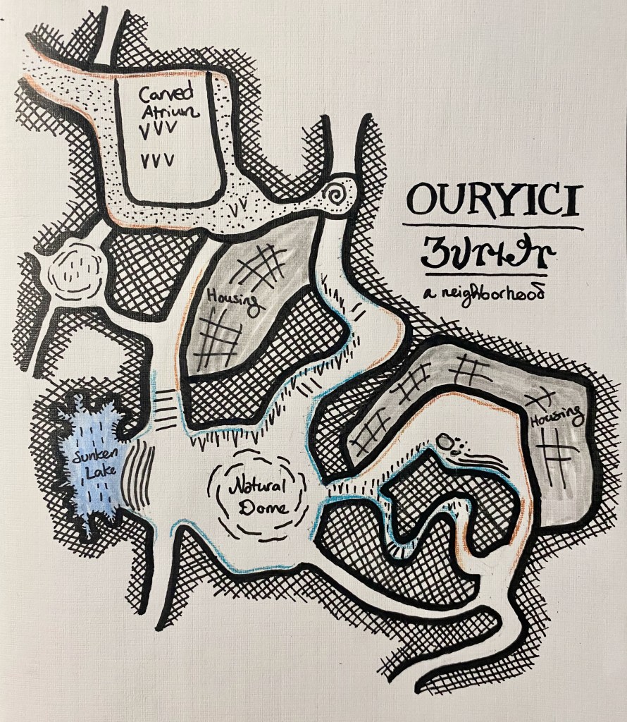 This one was tricky. I studied a lot of caving maps, trying to get a sense of how to make a map for subterranean settlement. This has promise, but looks too much like a D&D map. But this is the first time I’ve tried this and I’ll learn as I go and find a style that resonates with me.