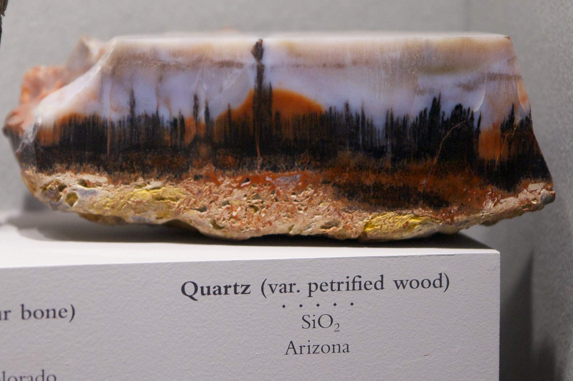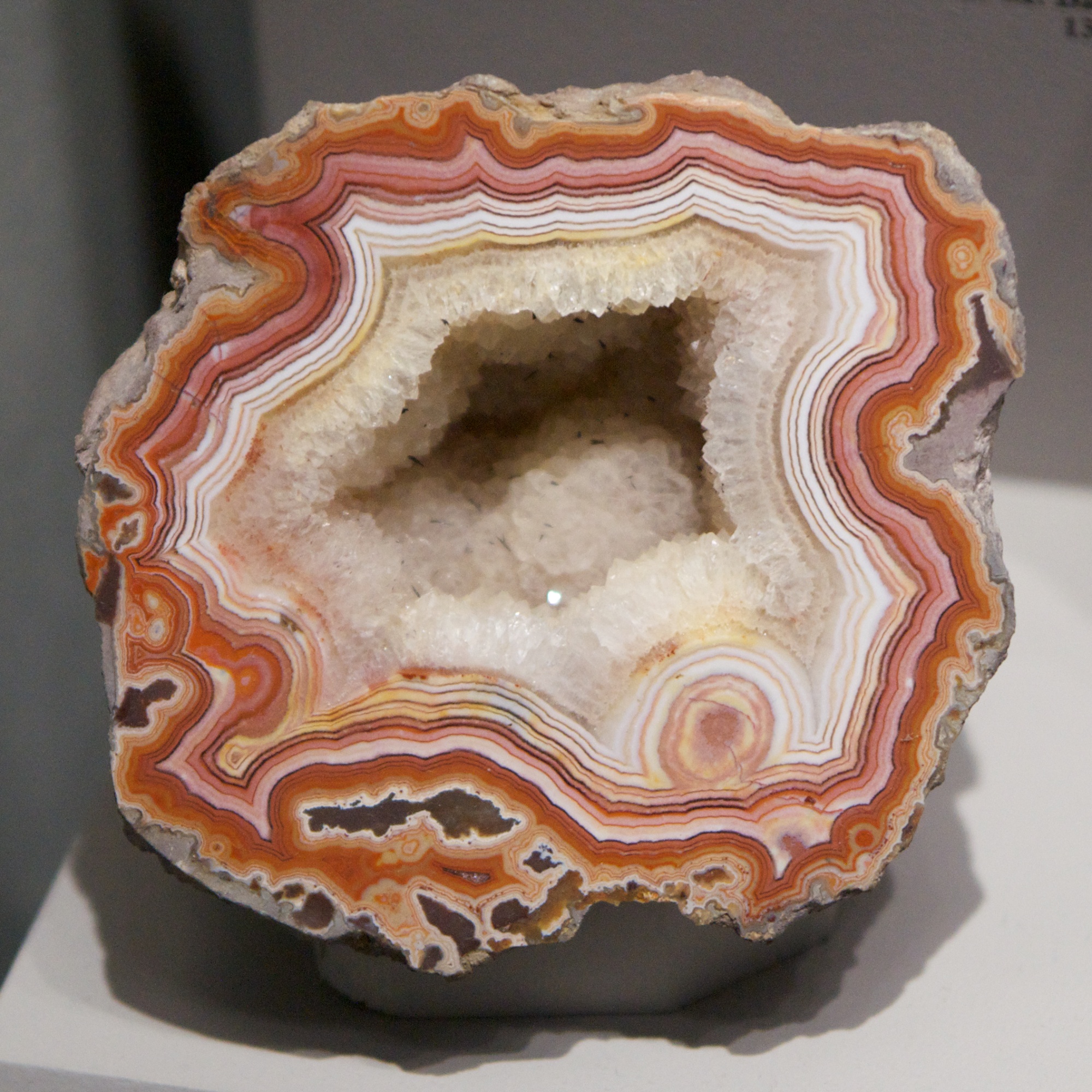 Quartz: quartz is a very common type of type of mineral (the second most common after feldspar), made up of silicon and oxygen. This variation is called agate. I used to buy agate slices as a kid, but the Smithsonian’s are slightly fancier.
