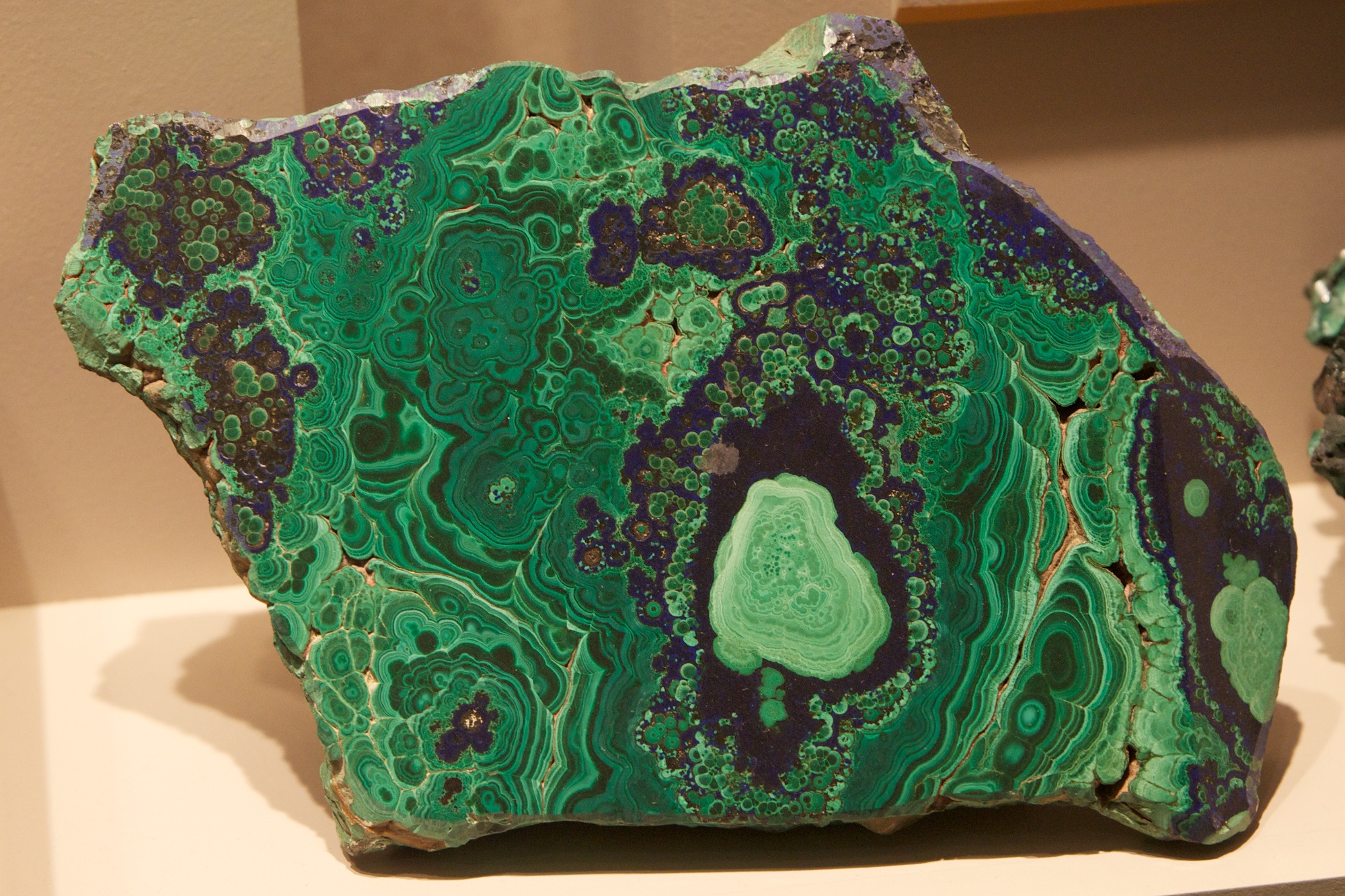 Malachite with azurite: both malachite and azurite are compounds of copper with oxygen, carbon, and hydrogen. The two differ only in the ratios. By geological standards, this rock formed somewhat quickly. We can tell this because the crystals are numerous and small. Single, large crystals form more slowly. This is why you should make ice cream at low temperatures, because when you freeze it quickly, many tiny crystals form, producing a better texture.