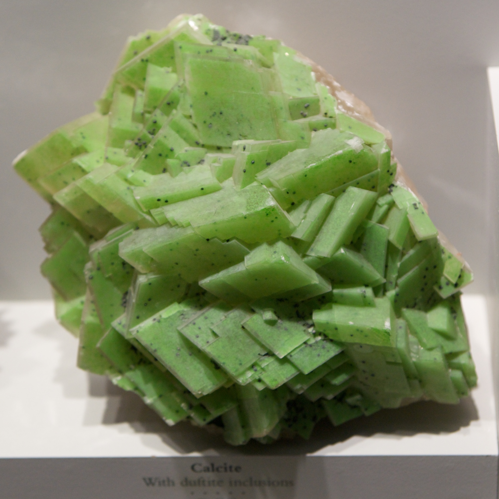 Calcite with duftite inclusions: Calcite is known for its optical properties such as birefringence. It was used as a material for gun sights in World War 2. Duftite is a compound of lead, copper, and arsenic. It is the duftite that gives the distinctive green color. I think of this as the kiwi mineral, as it even has the seeds.